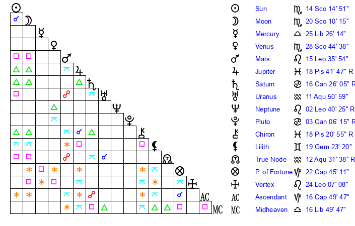 | Moon | 20 Scorpio 0 | 27 Capricorn 15 | 13 Scorpio 35 |
