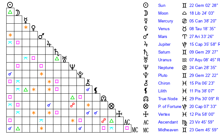 | Sun | 22 Gemini 2 | 22 Gemini 56 | 9 Libra 52 |