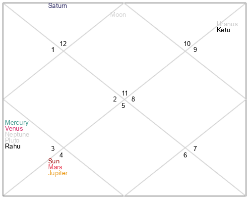 | Rahu | 4 Cancer 0 | 21 Pisces 4 | 27 Gemini 48 |