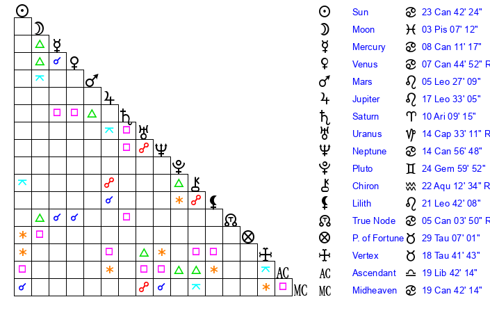 | Neptune | 14 Cancer 57 | 2 Aries 7 | 17 Cancer 0 |