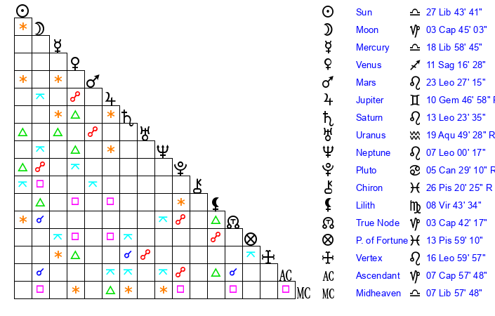 | Sun | 27 Libra 43 | 28 Libra 33 | 17 Aquarius 7 |