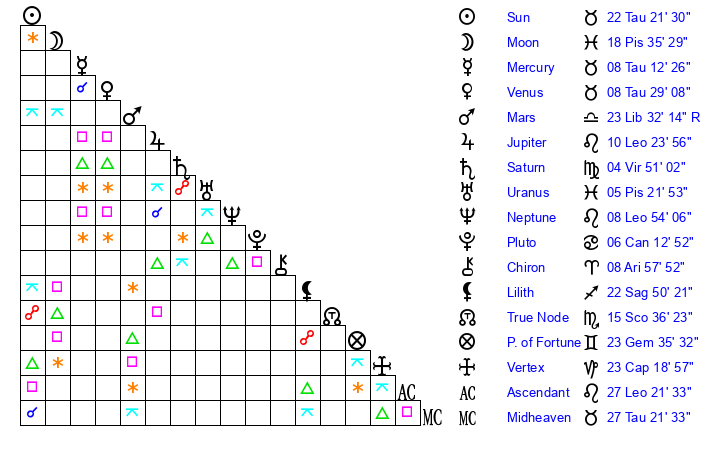 Mercury | 8 Taurus 13 | 5 Taurus 6 | 19 Leo 52 |