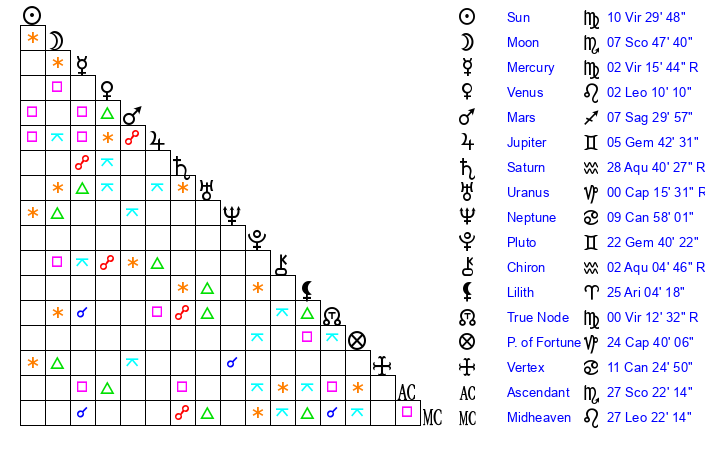 | Sun | 10 Virgo 30 | 11 Virgo 27 | 10 Capricorn 24 |