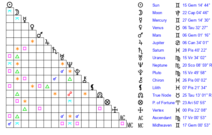| Pluto | 15 Virgo 50 | 3 Aquarius 34 | 16 Virgo 58 |