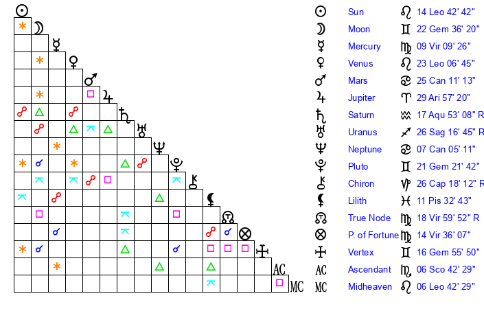 | Sun | 14 Leo 43 | 15 Leo 26 | 14 Sagittarius 11 |