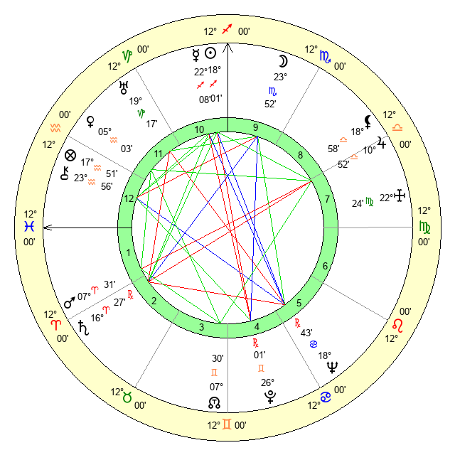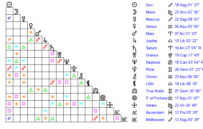 | Moon | 23 Scorpio 56 | 16 Aries 22 | 3 Aquarius 59 |