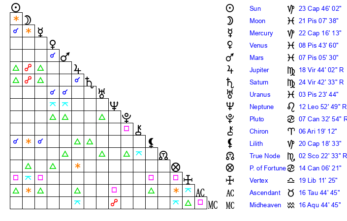 Sun | 23 Capricorn 46 | 24 Capricorn 32 | 7 Taurus 36 |