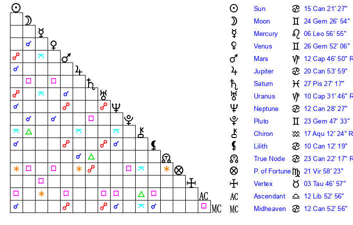| Pluto | 23 Gemini 48 | 2 Aquarius 57 | 24 Gemini 32 |