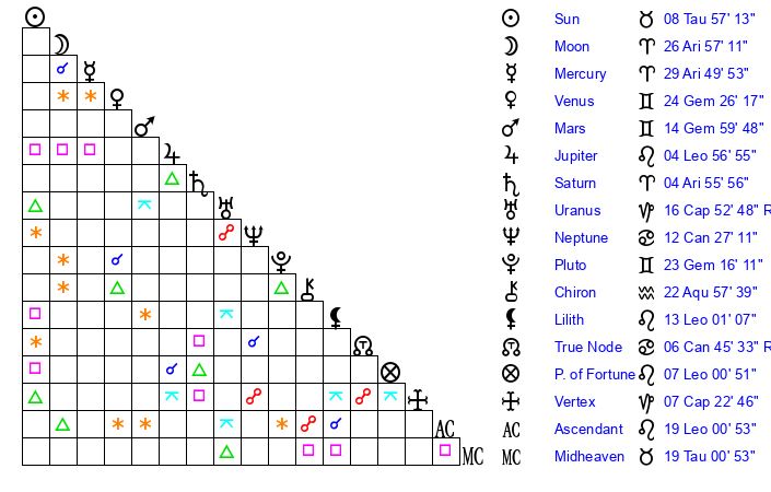 | Moon | 26 Aries 55 | 6 Gemini 33 | 6 Leo 37 |