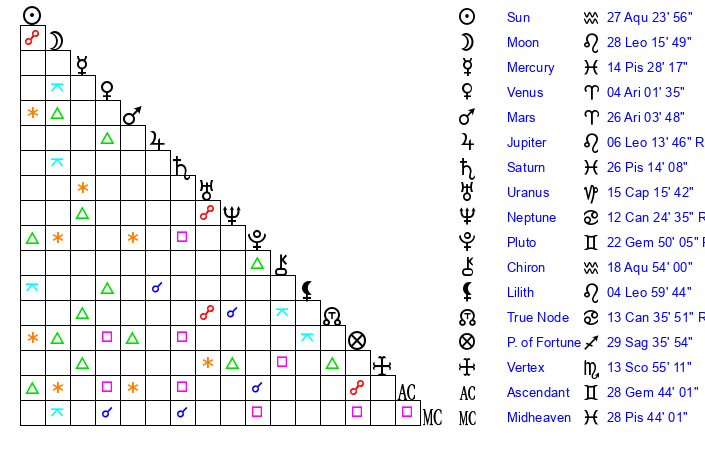 | Sun | 27 Aquarius 24 | 29 Aquarius 2 | 22 Gemini 0 |