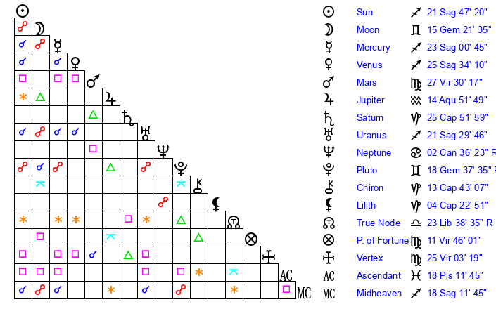 | Moon | 15 Gemini 22 | 14 Gemini 22 | 8 Sagittarius 14 |