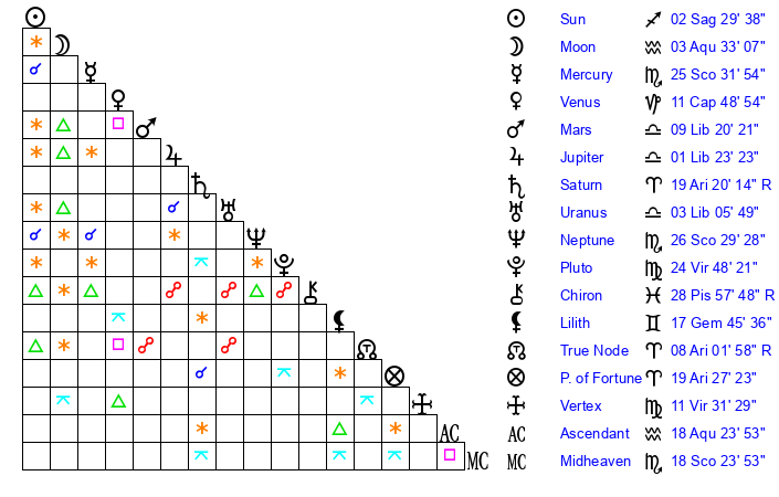 | Moon | 3 Aquarius 25 | 21 Virgo 2 | 20 Aquarius 8 |
