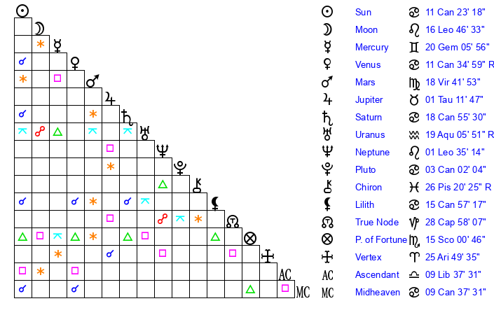 | Saturn | 19 Cancer 35 | 1 Aries 45 | 0 Leo 51 |