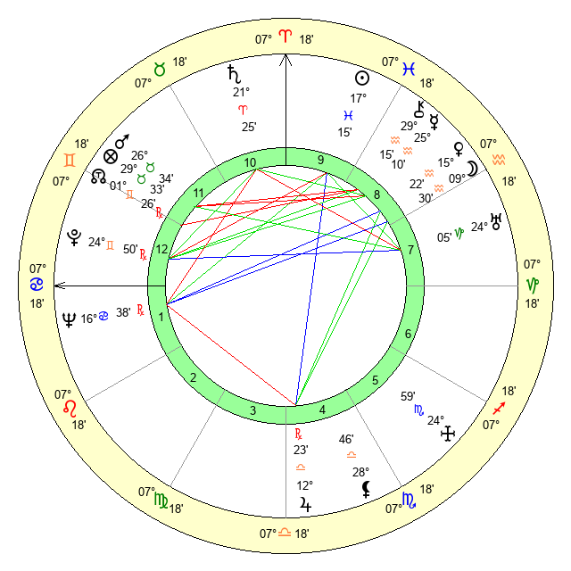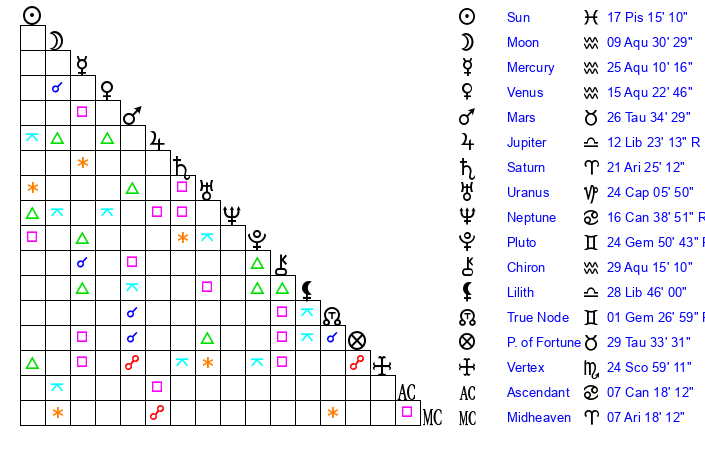 | Sun | 17 Pisces 15 | 18 Pisces 22 | 8 Cancer 57 |