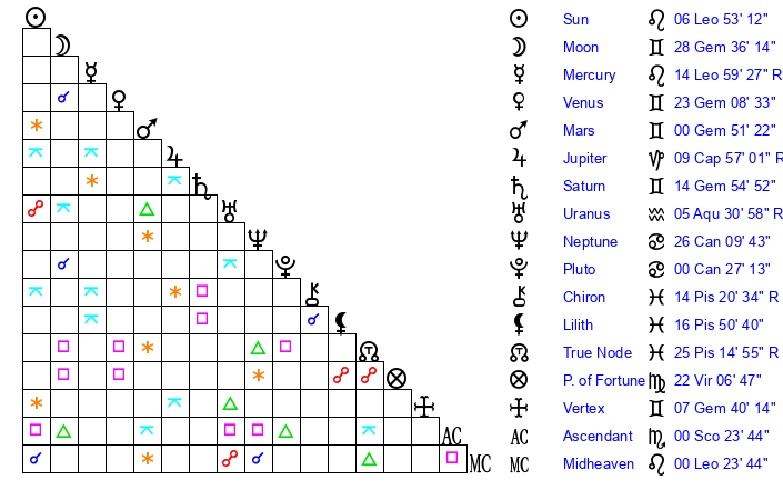 | Mercury | 14 Leo 59 | 9 Leo 57 | 4 Sagittarius 55 |