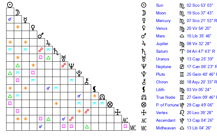 | Moon | 19 Scorpio 43 | 0 Capricorn 6 | 5 Pisces 6 |