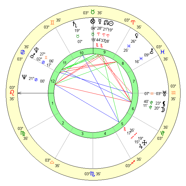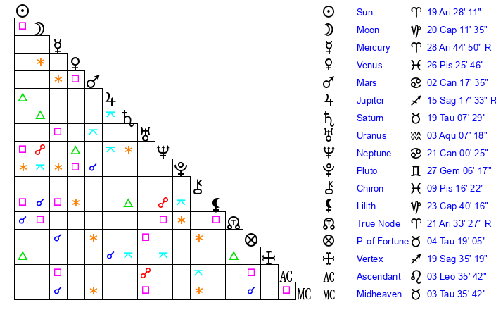 | Sun | 19 Aries 28 | 20 Aries 5 | 8 Leo 4 |