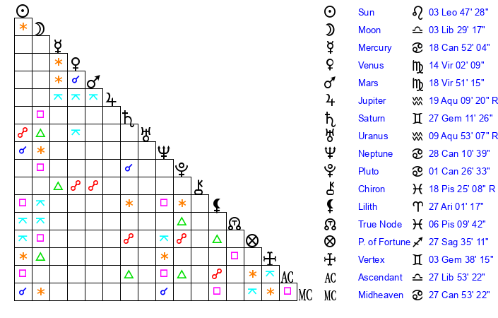 | Moon | 3 Libra 30 | 10 Virgo 48 | 24 Libra 40 |