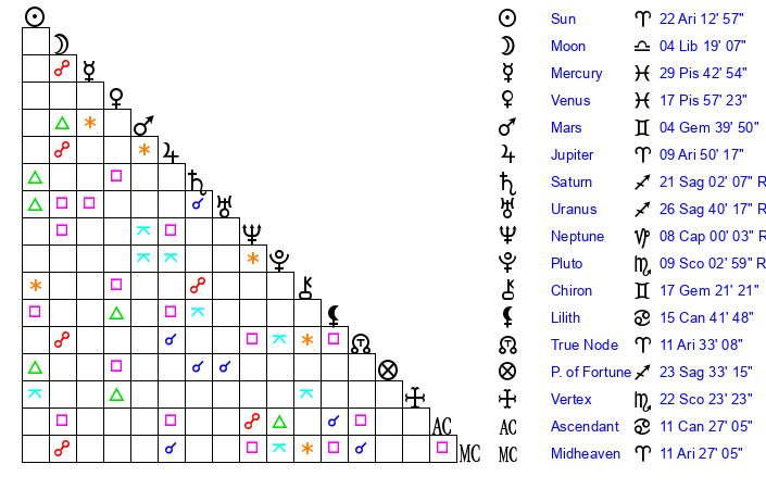 | Moon | 4 Libra 21 | 19 Libra 6 | 5 Pisces 31 |