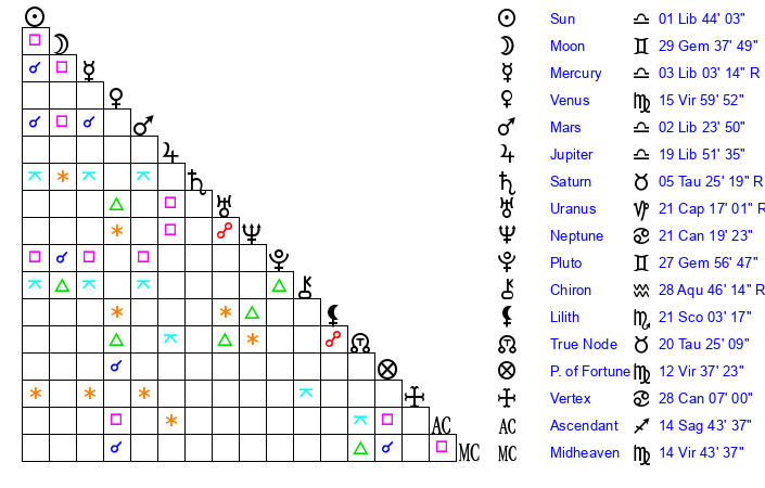 | Moon | 29 Gemini 30 | 15 Scorpio 55 | 16 Virgo 35 |
