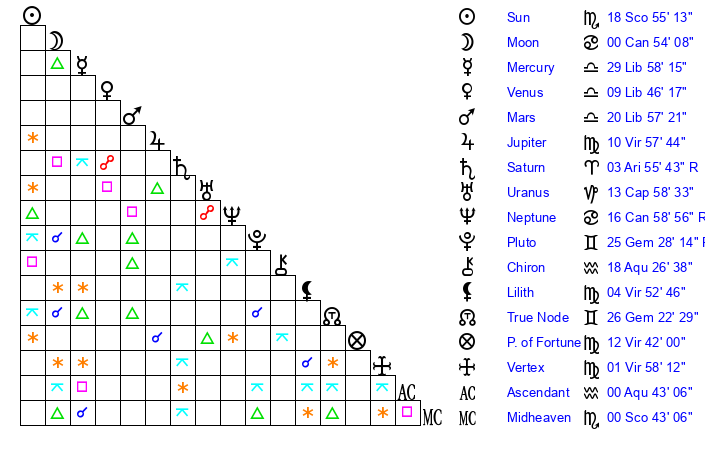| Moon | 0 Cancer 54 | 21 Pisces 59 | 22 Virgo 51 |