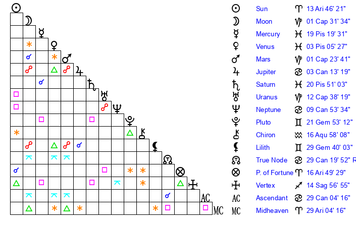 | Sun | 13 Aries 47 | 15 Aries 10 | 7 Leo 19 |