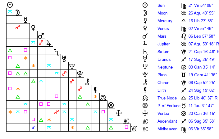 | Sun | 21 Virgo 54 | 23 Virgo 6 | 25 Capricorn 25 |