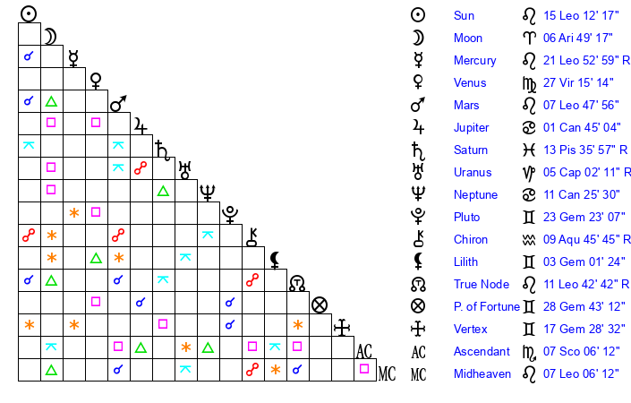 | Moon | 6 Aries 54 | 8 Aquarius 41 | 4 Leo 12 |