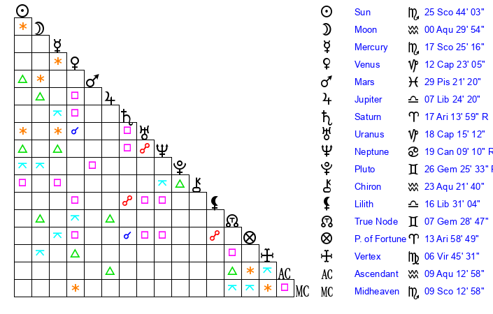 | Sun | 25 Scorpio 44 | 26 Scorpio 51 | 22 Pisces 15 |