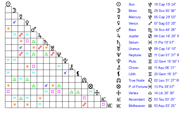 | Sun | 19 Capricorn 20 | 20 Capricorn 42 | 16 Taurus 57 |