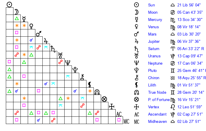 | Sun | 21 Libra 56 | 22 Libra 35 | 20 Aquarius 20 |