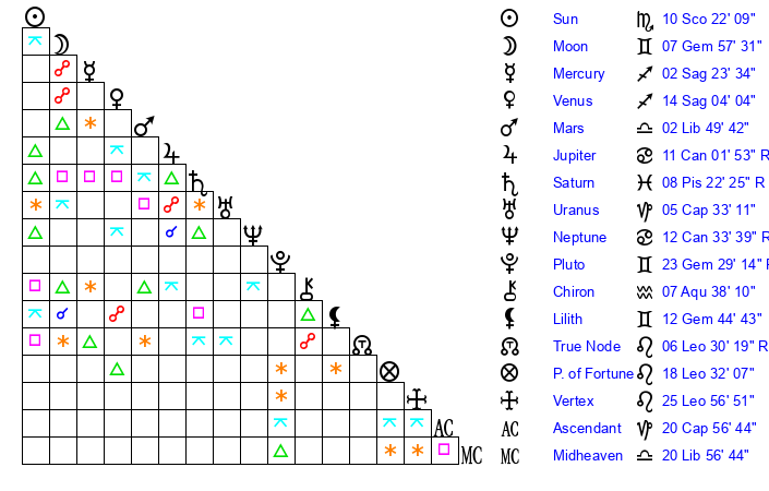 | Sun | 10 Scorpio 22 | 11 Scorpio 31 | 10 Pisces 59 |