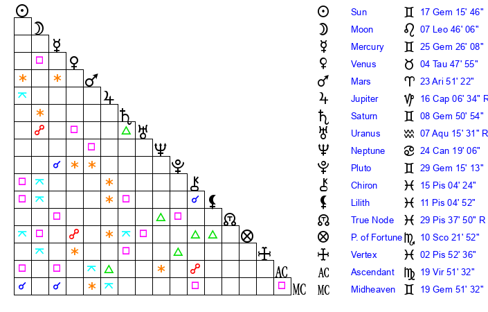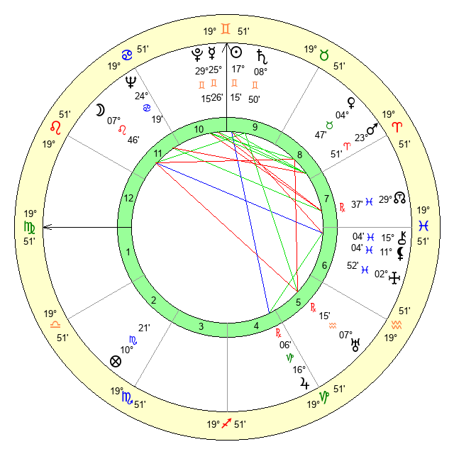 | Sun | 17 Gemini 16 | 18 Gemini 9 | 4 Libra 57 |