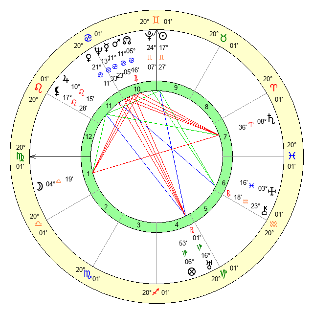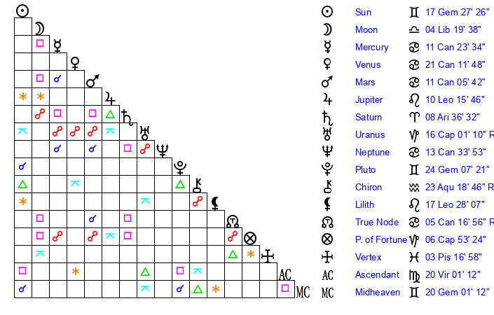 | Sun | 17 Gemini 28 | 18 Gemini 9 | 10 Libra 4 |