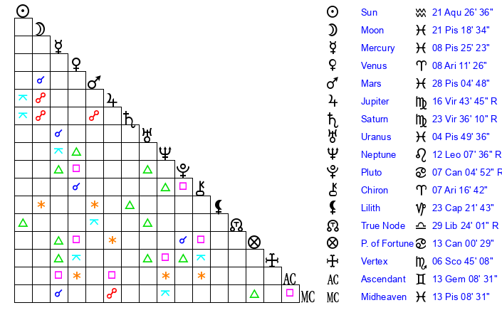Sun | 21 Aquarius 26 | 22 Aquarius 12 | 3 Gemini 55 |
