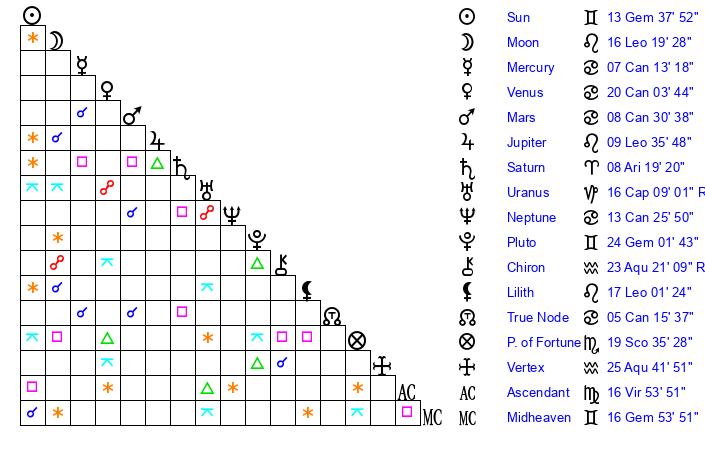 | Sun | 13 Gemini 38 | 14 Gemini 19 | 6 Libra 8 |