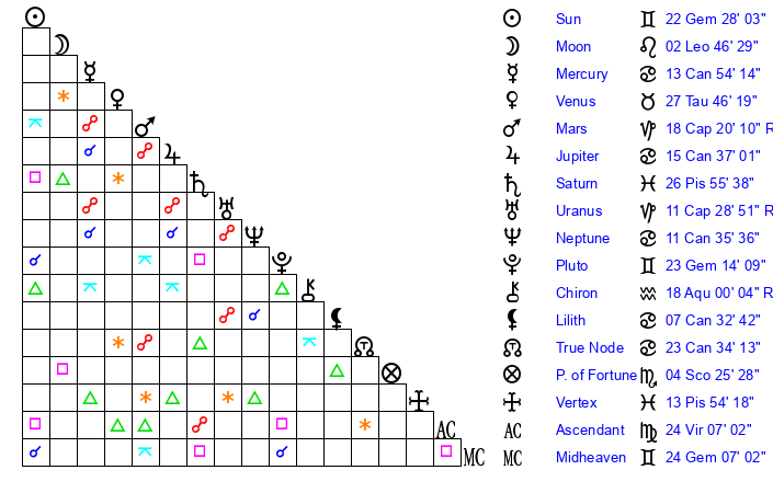 | Sun | 22 Gemini 28 | 23 Gemini 53 | 16 Libra 14 |