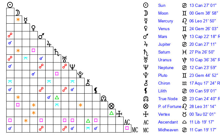 | Sun | 13 Cancer 27 | 14 Cancer 52 | 8 Scorpio 8 |