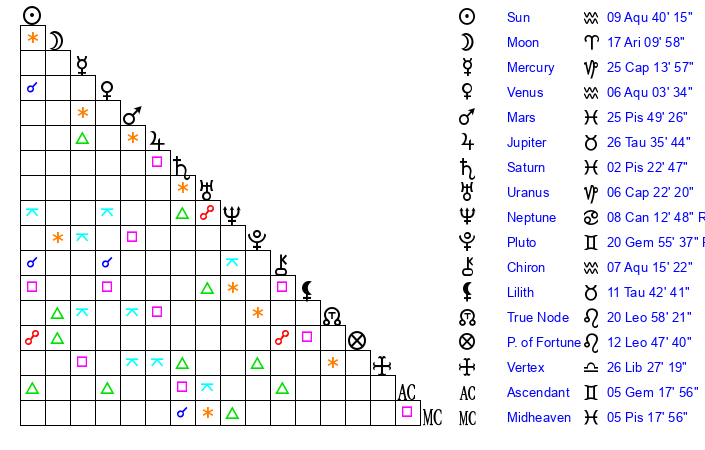 | Moon | 17 Aries 10 | 22 Aquarius 53 | 15 Leo 27 |