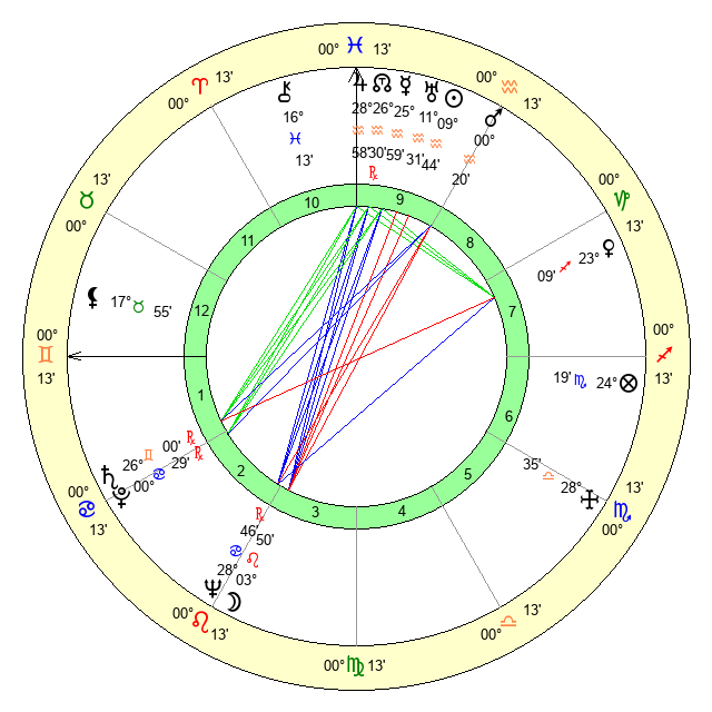 | Jupiter | 28 Aquarius 45 | 11 Gemini 18 | 23 Pisces 0 |