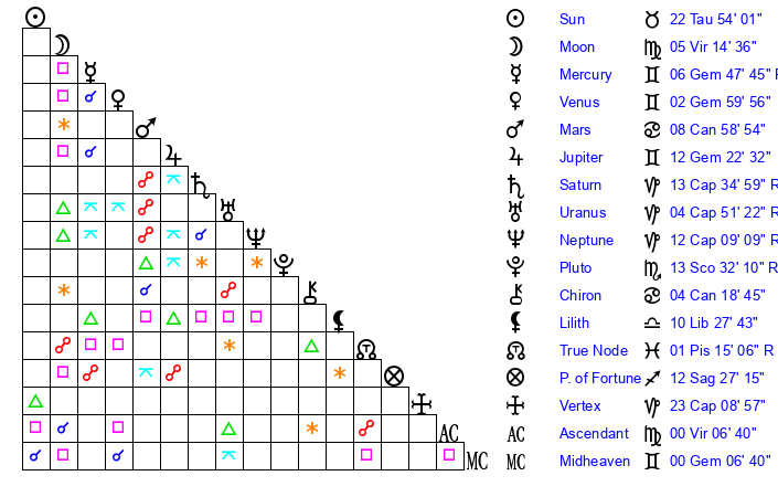 | Sun | 22 Taurus 54 | 23 Taurus 11 | 27 Gemini 25 |