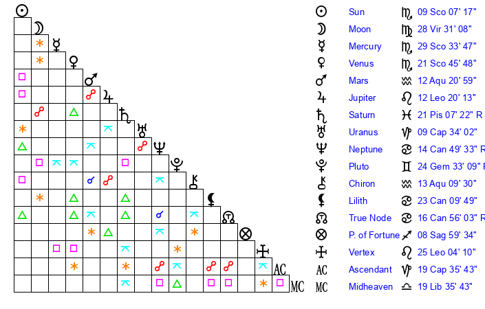 | Venus | 21 Scorpio 47 | 24 Libra 42 | 17 Aries 29 |