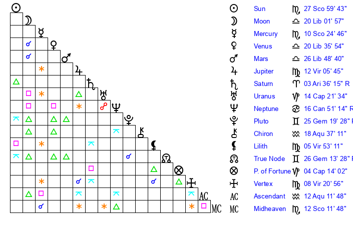 | Venus | 20 Libra 36 | 10 Capricorn 37 | 14 Pisces 28 |