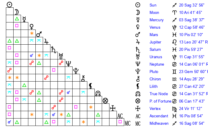 | Sun | 20 Sagittarius 33 | 22 Sagittarius 11 | 18 Aries 27 |
