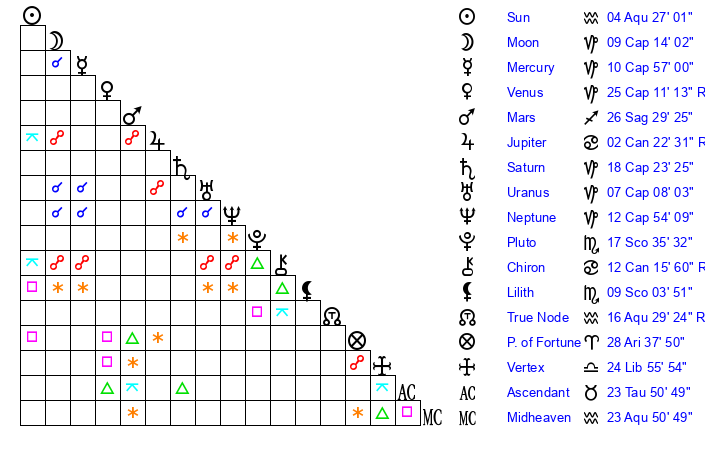| Sun | 4 Aquarius 27 | 4 Aquarius 58 | 9 Pisces 51 |