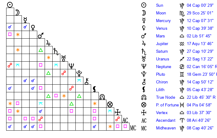 | Moon | 29 Scorpio 20 | 16 Scorpio 19 | 8 Taurus 12 |