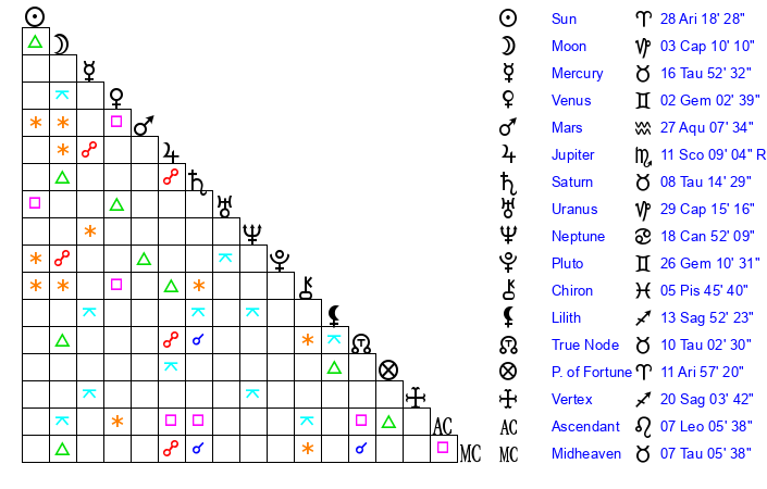| Sun | 28 Aries 19 | 29 Aries 41 | 17 Leo 41 |
