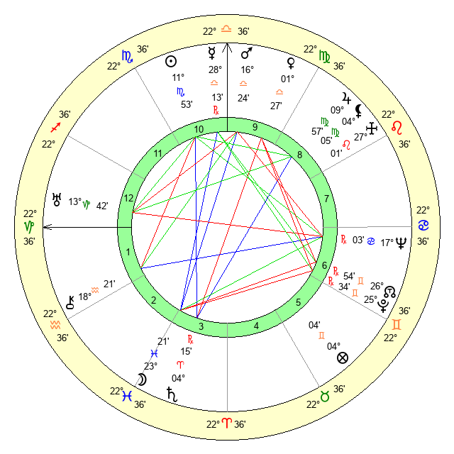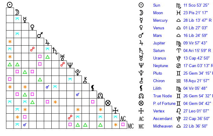 | Sun | 11 Scorpio 53 | 12 Scorpio 46 | 9 Pisces 29 |