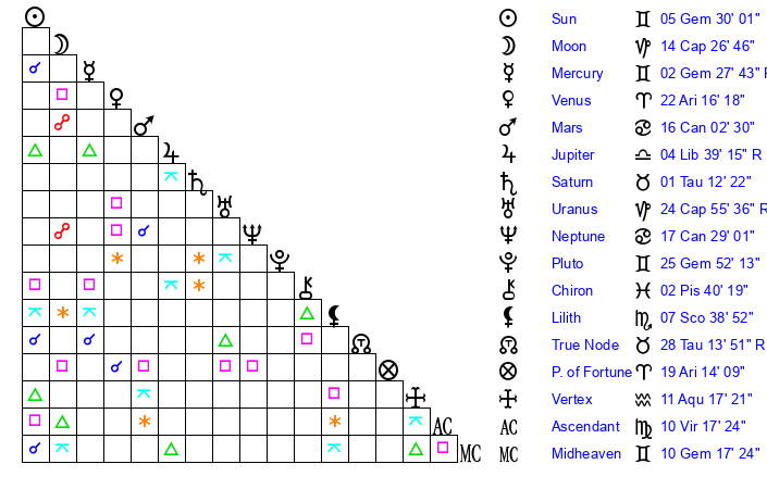 | Moon | 14 Capricorn 29 | 14 Gemini 53 | 2 Aries 35 |
