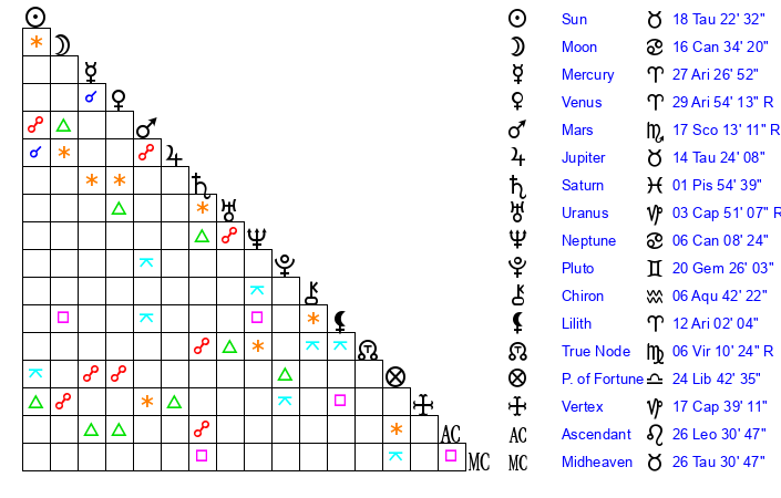 | Sun | 18 Taurus 23 | 19 Taurus 19 | 13 Virgo 24 |